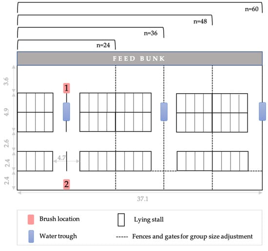 Pen layout for different group sizes (n = 24, 36, 48, 60) of lactating cows, showing the two locations (1: feed alley, 2: back alley) where the automated cylindrical-shaped brush was provided. Pen dimensions are shown in m.