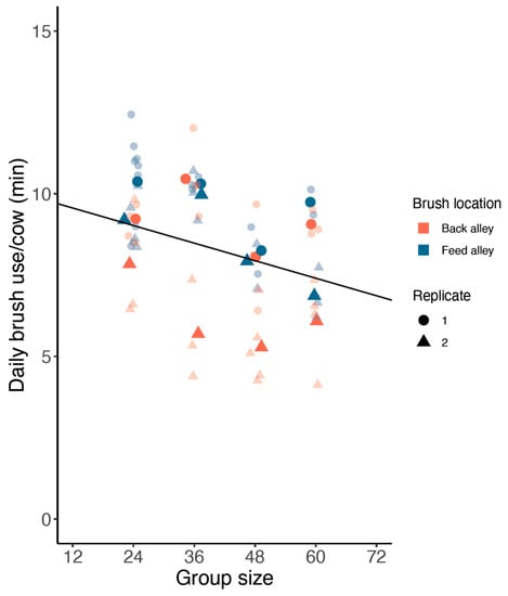 Average daily brush use per cow decreased with increasing group size (Figure 2, by 0.5 ± 0.2 min/day/cow for each additional group of 12 cows added; F1,12 = 5.5, p = 0.04). Cows used the brush more when it was placed in the feed alley (an increase of 1.4 ± 0.5 min/day/cow, F1,12 = 7.06, p = 0.02) and brush use was lower during the second replicate (by 2.1 ± 0.5 min/day/cow, F1,12 = 16.33, p = 0.002). The average daily temperature was also lower during the second replicate (by 8.9 ± 2.5 °C, p = 0.003). The average hourly brush use in the groups did not differ between daytime and nighttime.