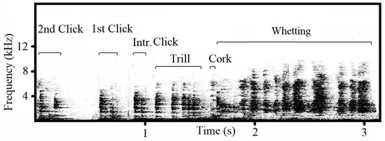 After selection, song phases (clicks, trill, cork and whetting) were manually labelled within each recording (