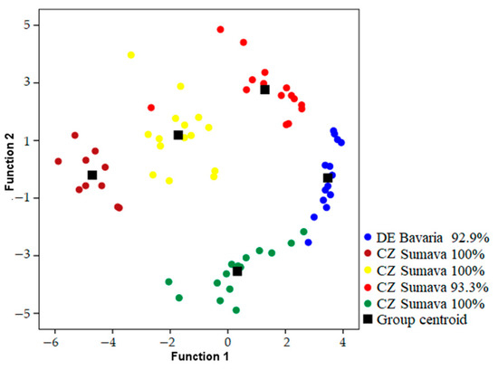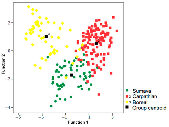 p ˂ 0.001). The first two discriminant functions had eigenvalues > 1, while the first function had eigenvalues > 3 and explained 71.3% of the variation. The first discrimination function strongly correlated with a short whetting duration (r = 0.595) and cork central frequency (r = −0.510), while the second discrimination function correlated with the first trill central frequency (r = 0.505). Songs of males from the Carpathian area reached the best classification accuracy (94.9%). Songs from Sumava were classified with 88.4% accuracy, and the Boreal area with 86.2% accuracy (
