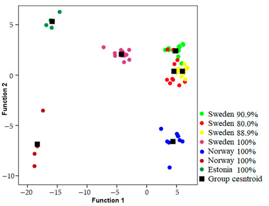 The cluster analysis (cophenetic correlation coefficient c = 0.80) revealed that males from the Boreal area formed a distinct cluster, while males from geographically closer regions (i.e., Carpathian area and Sumava) partly overlapped. In comparison to all other males from the Boreal area (Norway, Sweden), a male from Estonia was included in the Carpathian cluster (