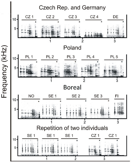 Potential vocal divergence across distant populations could follow genetic differentiation caused by geographic isolation and inter-population distances. We have found a clear vocal distinctness based on geography. A clustering method revealed that males from Sweden and Norway (Boreal area) formed a distinct cluster from males in the Czech Republic, Germany and Poland (Sumava and Carpathian area). Males from Bavaria clustered with Sumava, and males bred in Krasna (Czech Beskid) clustered with other Carpathian males from Polish Beskid. Surprisingly, a male from a continuous boreal distribution in Estonia revealed similarity with Carpathian males. This could reflect the higher similarity of “continental” populations (Baltic countries) to central European countries despite the fact that these populations inhabit continuous boreal taiga as well as populations from Fennoscandia; however, they are geographically separated by the Baltic Sea. Such speculation needs to be verified by more robust sampling.