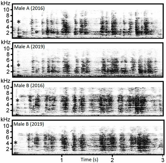p ˂ 0.001). The first two functions had eigenvalues > 2 and described 64% of the variation. The first five functions had eigenvalues > 1 and described 92.5% of the variation. The first function correlated strongly with the last trill interval (r = 0.599), and the second function correlated with first trill F95 (r = −0.281) and last trill F95 (r = −0.267). Individual variation can also be seen on the spectrogram (
