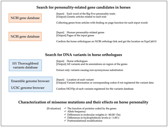 Firstly, human personality-related genes were identified using the search term “personality trait” in the National Center for Biotechnology Information (NCBI) gene database [22]. Subsequently, relevant articles dealing with the identified genes were collected; the articles discussed each facet of the Big Five personality traits: Agreeableness, Conscientiousness, Extraversion, Neuroticism, and Openness. These categories have been determined to be heritable in humans [23]. Horse genes orthologous to the identified human genes were searched against the NCBI gene database.
