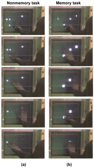 The task was controlled by standard PC-type computers running under Windows XP© and Windows 7 © OS. The program controlling the experimental session was made with Visual Basic © 6.0. The entire experiment was preprogrammed with the previously determined stimulus sequence and position sequence files. The food reward was delivered by an automatic feeder (Bio Medica: BUF-310-P50, Osaka, Japan) connected to the computer. The feeder had a disc of 50 small compartments, and a brush rotation automatically delivered a piece of food to the place just below the touch panel. Thus, daily cognitive test sessions were fully automated in preplanned ways and with no interference by experimenters. This means that there was no social cueing.