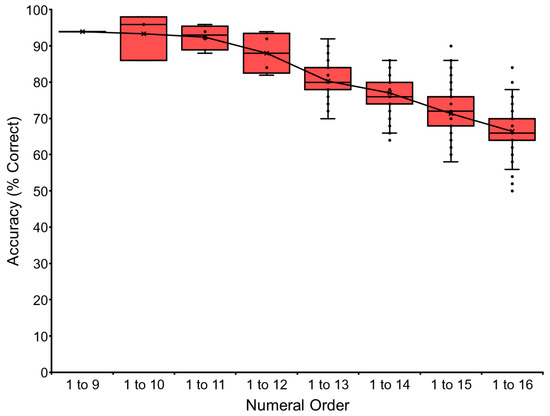The baseline training of the VNM-Startfix task continued up to 1 to 16 for chimpanzee Ai. Figure 4 shows Ai’s performance as the representative. Accuracy gradually dropped as a function of the number of numerals to be processed. Ai reached the level of sequentially touching numerals from 1 to 16, but not more. We stopped at this point to avoid too much pressure on the chimpanzee. The other chimpanzees followed the same pattern. Ayumu reached the stage of 1 to 18, and Pal reached 1 to 17. Data for each chimpanzee and the average performance of the six chimpanzees are shown in Table 3 and Appendix A.3. See the trials in the Supplementary Materials (Video S1: video clip of Ayumu for the VNM-Startfix 1 to 17 task).