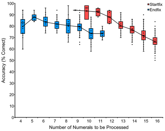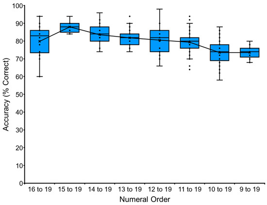 Data of chimpanzee Ai in the baseline training of the VNM-Endfix task. The chimpanzee had to touch the numerals from X to 19 in ascending order. Y-axis showed the accuracy (% correct). The boxplot shows the quartile range of performance and the line shows the average accuracy.
