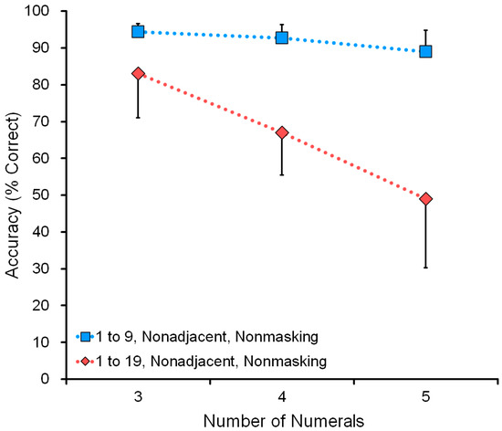 Baseline training occurred each day. The chimpanzees received baseline training on the VNM task whenever they came to the booths. This was done to improve their performance at ordering numerals while evaluating daily fluctuations in performance in each individual. In general, the criteria for moving to the next condition were kept constant, i.e., more than 90% correct in a session. However, in some chimpanzees, the criterion gradually shifted to 85% and then 80% accuracy in a session, depending on their performance. The whole experiment was designed to make the tasks gradually more demanding based on each individual’s daily performance (see Section 4.1 and Section 4.2).