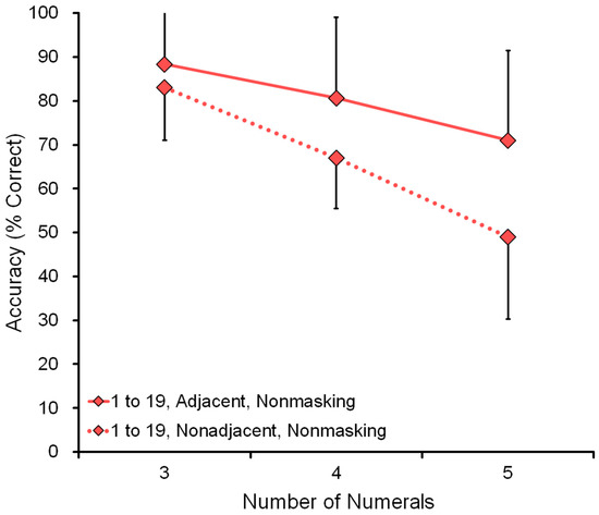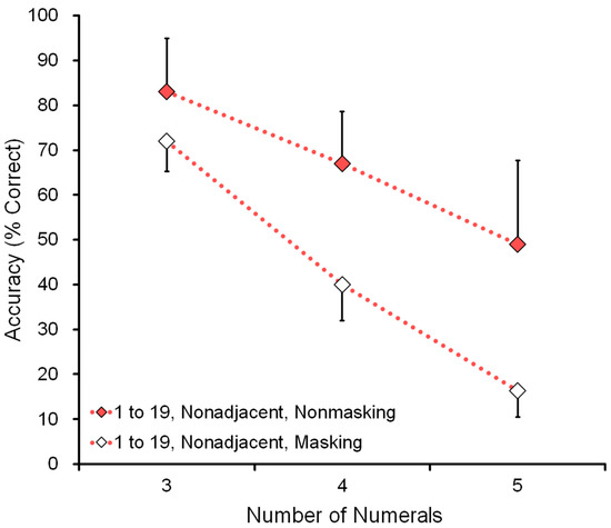 Table 4 shows all individual data in which all four factors had a significant effect. First, for all six participants, the range 1 to 19 was more difficult than 1 to 9. Second, the nonadjacent numerals were more difficult than adjacent ones. Third, the memory task was more difficult than the nonmemory task. Fourth, in all conditions, when the number of numerals increased to three, four, and five, the task became more difficult. There was almost no exception in the conditions of 2 × 2 × 2 × 3 = 24 cases (range × adjacency × memory × number of numerals) in all six individuals. There were some exceptional cases among 144 cells. For example, in three cases Ayumu performed better on the masking (memory) task than the nonmasking (nonmemory) task. For Ayumu, the memory task was as easy as the nonmemory task, due to a sort of ceiling effect (100, 98, and 96% accuracy in a session of 50 trials), alongside inevitable small daily fluctuations in performance.