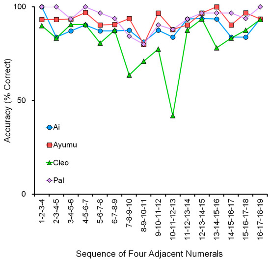 In addition to the four factors, there is a unique problem with numerals in the decimal number system: the carryover at the numeral 10. We gave an assessment test to evaluate the difficulty of processing the numeral 10 in chimpanzees. The task was to touch four adjacent numerals in the range 1 to 19. Thus, there were 16 patterns in this task: 1-2-3-4, 2-3-4-5, 3-4-5-6, and so on up to 16-17-18-19. One of them was randomly presented in a session of 50 trials. We ran this test 10 times, for a total of 500 trials for each chimpanzee. Thus, each of the 16 patterns was tested 31 or 32 times. We collected the data for each pattern at the end of the study period. This is an assessment test and also a part of the intensive training of adjacent numerals including the numeral 10.