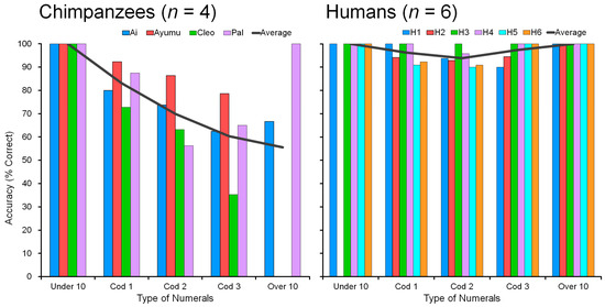 Chimpanzees and monkeys can provide a unique opportunity for applying various tests in the same situations as humans. Ferster (1964) first used the binary number system in which two chimpanzees learned from 1 (001) to 7 (111) by turning three lights on and off [47]. By introducing Arabic numerals, it is possible to match the chimpanzee studies precisely to studies in humans. Matsuzawa (1985) [48,49] and Boysen and Berntson (1989) [50,51] started to use Arabic numerals to represent numbers. Chimpanzee Ai of the Primate Research Institute of Kyoto University (KUPRI) learned to use Arabic numerals arranged on a keyboard connected to a computer [48]. She learned to use the numerals from 1 to 6 on the keyboard and combined the skill with naming colors and objects shown in a display window. This task is referred to as symbolic matching-to-sample (symbolic MTS). She succeeded to press the corresponding keys for “red” + “pencil” + “5” in sequence for describing five red pencils that were shown to her. Ai mastered the skills of both ordinals and cardinals, and coding and decoding [52,53,54]. The ordinal sequence of numerals was expanded from 1 to 9 [55,56]. Additionally, Ai learned the meaning of the numeral 0 [53]. The other chimpanzees of KUPRI have also learned numbers in various tasks in this line of studies [57,58,59,60].