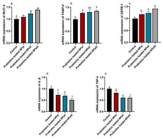 Effect of feeding Ross broilers (n = 5/group) different levels of Bacillus amyloliquefaciens-encapsulated nanoparticles (BNPs I, II, and III) on the relative mRNA expression of mucin-2 (MUC-2, (a)), fatty acid-binding protein-2 (FABP-2, (b)), beta-defensin 1 (DEFB-1, (c)), interleukin-1beta (IL-1β, (d)), and tumor necrosis factor-alpha (TNF-α, (e)). The data represented the relative mRNA expression normalized to GAPDH and the significance is p < 0.05. a–d Mean values within columns showing numerous letters differ statistically.