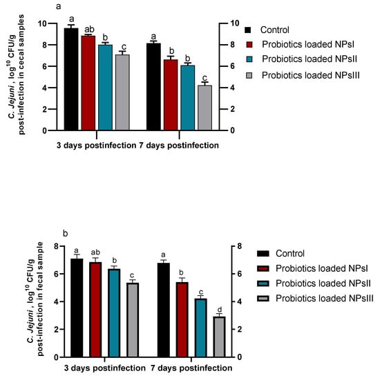 Effect of feeding Ross broilers (n = 5/group) different levels of Bacillus amyloliquefaciens-encapsulated nanoparticles (BNPs I, II, and III) on colonization and shedding of Campylobacter jejuni (C. jejuni) in cecal (a) and fecal (b) samples at 3 and 7 days post-infection compared to birds fed basal diet and the significance is p < 0.05. a–d Mean values within columns showing numerous letters differ statistically.