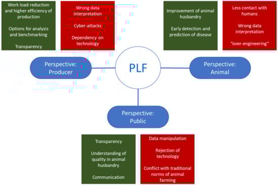 Evaluation of opportunities and risks of PLF. Summary based on (Raad voor Dierenaangelegenheiden [72]). From the different perspectives (animal, producer, public), different options arise.