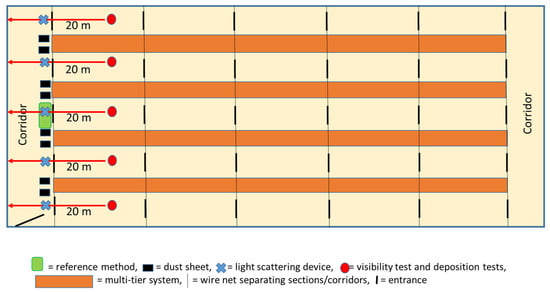 The level of dust in the air was assessed in the visibility test where the observer stood approximately 20 m from the end wall within each area between the multi-tier systems, facing the wall (Figure 1). The scoring scale used was developed based on the information gained during interviews with veterinary inspectors describing how they performed assessments of dust levels in poultry barns: