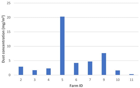 The dust concentration measured using the gravimetric principle varied between 0.3–20.3 mg/m3 in the layer barns visited (Figure 2).