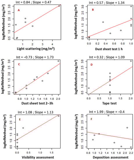 The regression lines (in red) for the log-transformed dust concentration from the reference method as a function of the dust level obtained using the methods under examination: (A) light scattering measurement, (B) dust sheet test 1 h, (C) dust sheet test 2–3 h, (D) tape test, (E) visibility assessment and (F) deposition assessment. The intercept (Int) and regression coefficient (slope) of each linear regression are given above the corresponding graph.