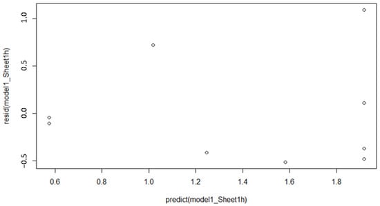 The light scattering device (Figure 3A) and the dust sheet test 1 h (Figure 3B) performed intermediate in regard to the distributions of the data points around the regression lines. Both methods had a significant slope, although at a lower significance level as for the dust sheet test 2–3 h. However, the adjusted R2 and the RMSE were relatively low (only for dust sheet 1 h) and high, respectively, i.e., showing a weaker correlation between dust levels collected using these methods and the reference method than those collected using the dust sheet test 2–3 h. The plot of the residuals against the dust concentration values predicted by the model for the dust sheet test 1 h showed increased variance with increasing concentration of dust (Figure 4). This indicates that the validity of the dust sheet test 1 h may be improved if the scale is further developed into a more detailed protocol with additional categories, e.g., five levels instead of the current three levels.