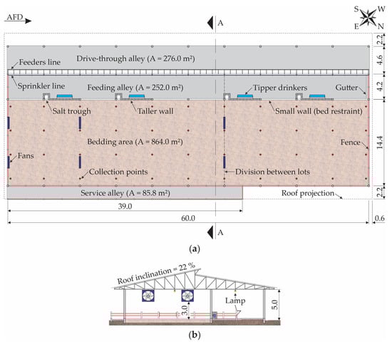 Schematic representation of the compost-bedded pack barn system where the data were collected: floor plan with collection points (a) and cross-sectional AA (b). AFD—air-flow direction; dimensions in meters (m); Source: Oliveira et al. [].