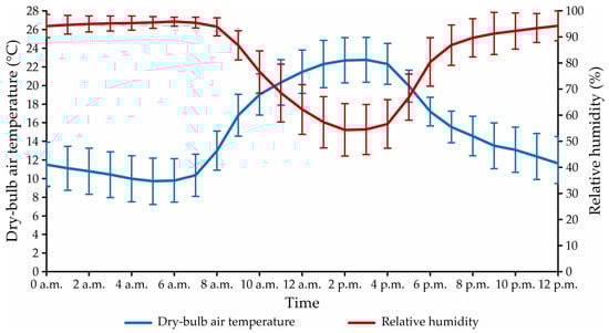 Curves of average hourly values, with standard deviation, of dry-bulb air temperature, and relative humidity throughout the day inside the CBP facility.