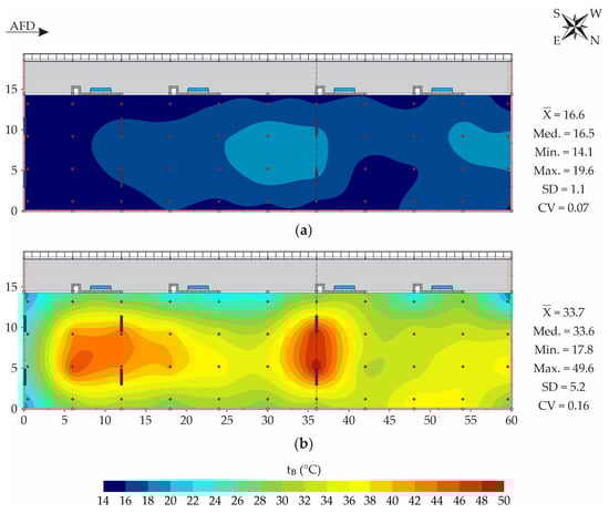 Spatial distribution of bedding temperature (tB, in °C) at the surface—tB-sur (a) and at a depth of 0.2 m—tB-20 (b). AFD—air-flow direction; —mean; Med.—median; Min.—minimum; Max.—maximum; SD—standard deviation; CV—coefficient of variation.