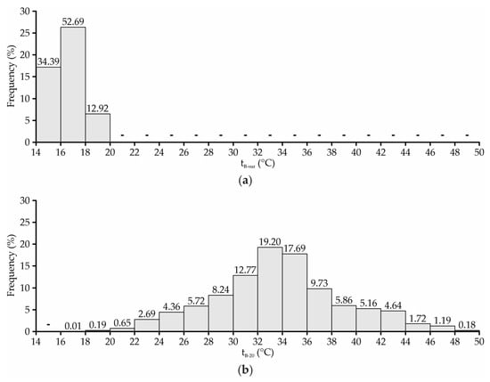 Frequency distribution of bedding temperature at the surface—tB-sur (a) and at a depth of 0.2 m—tB-20 (b).