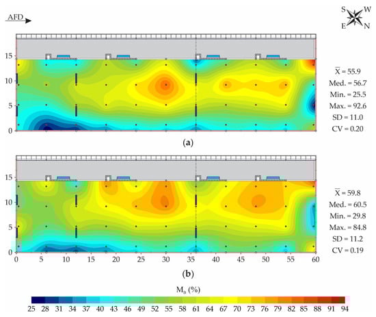 Similar spatial distributions were obtained for MB-sur and MB-20 (Figure 5), but the variation range was greater at the bedding surface (67.1% and 55.0%, respectively). This fact occurred due to the spillage of water by the animals after ingestion and during the cleaning of the feeding alley, as well as the deposition of feces and urine in the bedding’s superficial layer. The recording of MB-sur and MB-20 data with high variation is an indication that the ventilation system and the management applied to the bed were not able to ensure homogeneous conditions of humidity throughout the facility area.