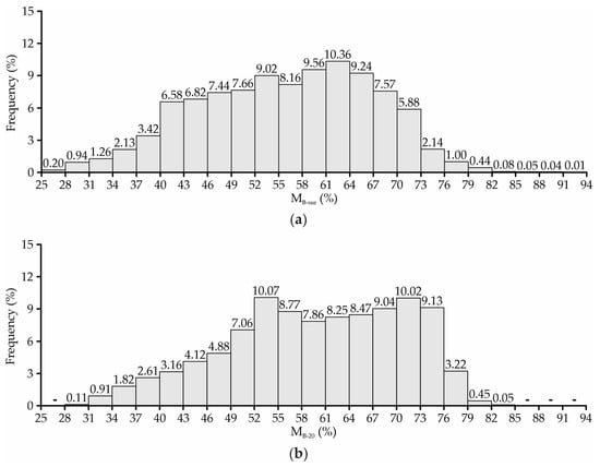 Frequency distribution of bedding moisture at the surface—MB-sur (a) and at a depth of 0.2 m—MB-20 (b).