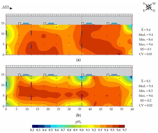 Spatial distribution of bedding hydrogenionic potential (pHB) at the surface—pHB-sur (a) and at a depth of 0.2 m—pHB-20 (b). AFD—air-flow direction; —mean; Med.—median; Min.—minimum; Max.—maximum; SD—standard deviation; CV—coefficient of variation.