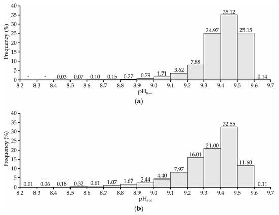 Frequency distribution of bedding hydrogenionic potential at the surface—pHB-sur (a) and at a depth of 0.2 m—pHB-20 (b).