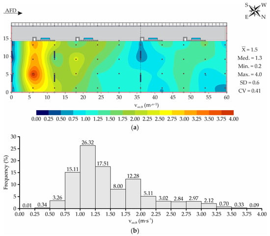 Spatial (a) and frequency (b) distribution of air velocity at bedding level (vair,B). AFD—air-flow direction; —mean; Med.—median; Min.—minimum; Max.—maximum; SD—standard deviation; CV—coefficient of variation.