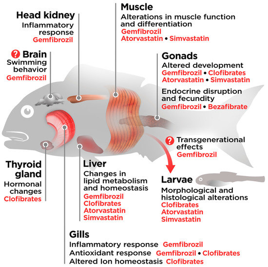 The inefficiency of wastewater treatment plants when it comes to the removal of these pharmaceuticals is translated by an inevitable exposure of both wild and cultured aquatic animals to these contaminants of emerging concern, even in closed systems, such as recirculated aquaculture systems (RAS), where they might accumulate in water. In both wild and laboratory-reared fishes, the consequences of exposure to fibrates and statins have been studied to varying extents, depending on compound and species, indicating the potentially deleterious effects of these contaminants on the overall health and welfare of fish (Figure 1). Here, we aim to compile existing knowledge on the effects of lipid-regulating agents, their environmental distribution, as well as their effects on fish, since these pharmaceuticals are likely to influence their lipid metabolism and nutritional quality, with a special interest in organisms that are highly relevant to aquaculture, and, therefore, directly linked to global food security and human health. We will also focus specifically on the most documented drugs, namely gemfibrozil, clofibric acid (a metabolite of clofibrate) and bezafibrate, representing the fibrates, and atorvastatin and simvastatin representing the statins.
