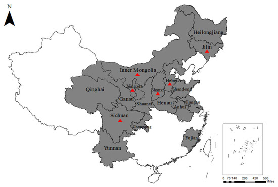 Map of China displaying the areas of sample collection. The 17 sampled regions are indicated in gray. The red triangles (