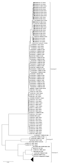 The BPIV3 genome is a negative-strand RNA of 15434–15504 bases in length, encoding six structural proteins (N, P, L, M, F, and HN) and three non-structural proteins (C, D, and V) [5,6]. According to HN gene sequence or complete genome sequence phylogenetic analysis, BPIV3 can be divided into three genotypes, A, B, and C, and genotype C was first identified in China [4]. Genotype C has since been found in Japan, the US, Korea, and Turkey [7,8,9,10]. So far, three BPIV3 genotypes have been found in China [11]. A seroepidemiological study of BPIV3 showed that the antibody positive rates of BPIV3 in the Jilin, Xinjiang, Inner Mongolia, and Shanxi regions were more than 80%, indicating that BPIV3 was widespread in northern China. A recent study showed that genotype C was the dominant strain in Inner Mongolia [12]; however, the prevalence and molecular characteristics of BPIV3 in China remain largely unknown.