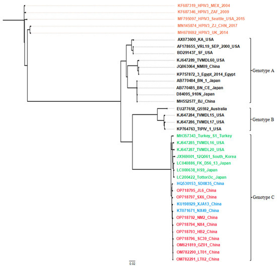 Phylogenetic tree based on complete genomes. A phylogenetic tree was created using the MrBayes software. The orange font represents human parainfluenza virus type 3 sequences; the green font represents overseas BPIV3 genotype C strains; the blue font represents BPIV3 genotype C strains uploaded by others in China; and the red font represents the Chinese strain sequences in this study.