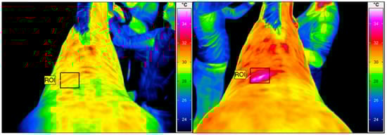 Thermographic images of the thoracolumbar back region. The square area (ROI) indicates the skin surface temperature before HILT (left), with an average temperature of 29.8 °C, and immediately after (right), with an average temperature of 32.9 °C.