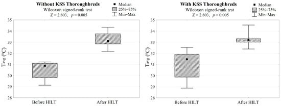 Differences in skin surface temperatures after HILT application in both groups (with/without KSS) and the Wilcoxon signed-rank test results. Tavg refers to the average skin surface temperature after HILT.