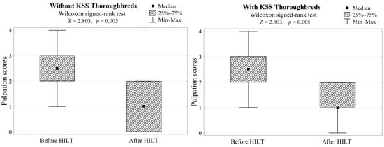 Differences in palpation scores after HILT application in both groups (with/without KSS) and the Wilcoxon signed-rank test results.