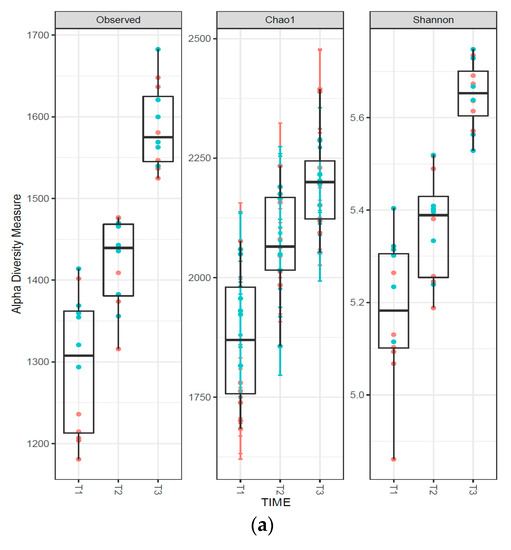 The alpha diversity of the populations, the relative abundance (%) of microbial components down to the family and sex level, and their grouping based on the sources of variation were estimated. Alpha diversity is an index of the richness (number) and diversity (relative abundance) of OTUs in a population. The richness of species is indicated by the total number of OTUs (“Observed”) in the microbial community: the higher the number, the more species are present. The CHAO1 index estimates the richness of species, giving more weight to the less abundant ones. The value of CHAO1 is at least equal to “Observed” and increases as the number of rarer species increases. It can be calculated as follows:
