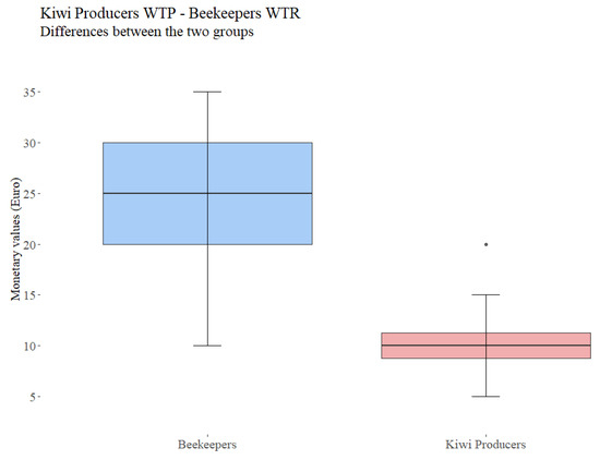 After noticing the willingness of farmers to pay or pay more for renting hives from local beekeepers, we conducted a Mann–Whitney test between the willingness of beekeepers to receive and of the farmers to pay EUR 24 per hive. This price has been detected through our questionnaires as the average price which will motivate the beekeepers to continue the provision of pollination services to kiwi production systems. Our findings highlighted no significant difference, and consequently, the value of EUR 24 per hive is commonly accepted by the two stakeholders (W = 155,