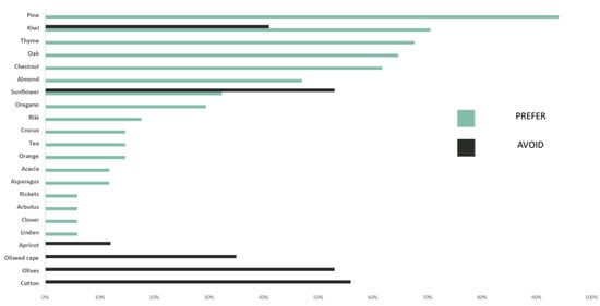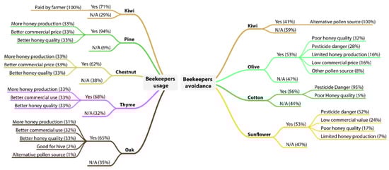 Advancing now to crops that are avoided by beekeepers, cotton obtained the most answers, with 56% of the responses, followed by olives and sunflowers, with 53%, and then kiwi, with 41%. The primary reason for crop avoidance is pesticide use, for example, cotton is widely unaccepted since it is associated with pesticide use (95% of answers) and poor-quality honey (5%). Similarly, sunflower was linked with pesticide danger (52%), and so were olives (28%). However, questions about sunflower and almonds received many controversial answers, as on the one hand, they offer valuable nectar resources for the bees, while on the other hand, they the farmers intensively use pesticides, which increases the bees’ mortality. Finally, 41% of them avoided kiwi orchard for two main reasons, the presence of other better pollen sources during this time of the year and the threat of pesticides.