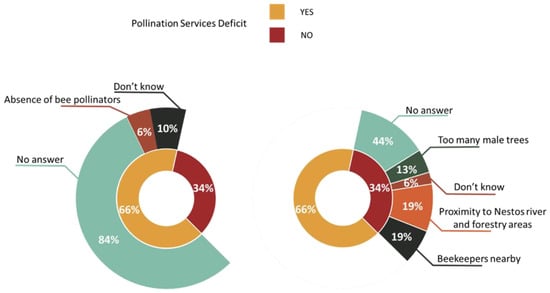 As already mentioned in the first part, 66% of the individuals surveyed claimed the presence of a pollination service shortage in their orchard, but when they were asked for the reasons behind this statement, 84% failed to respond, 10% had no idea what was behind this occurrence and only 6% associated this deficit with the lack of insect pollinators. The farmers who denied the presence of a pollination services deficit backed up their statement with more reasons than the farmers who thought there was a deficit did. Likewise, the majority of them (44%) gave no answer, 19% mentioned the presence of beekeepers nearby, another 19% justified their stance with their close location to the Nestos river and forestry areas, where there is beekeeping activity and high abundance of wild pollinators, 13% blamed the structure of the kiwi orchard, which contains many unproductive male plants rather than an insufficient number of pollinators, and the rest (6%) stated ignorance (