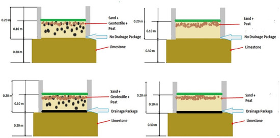 The design was a randomized block with two factors (23) with two-level with two repetitions (eight boxes). The factors were the addition of geotextile to the sand, which constitutes a depth cushion and the inclusion of a drainage layer over the limestone base. The absence of geotextile was designated as G1, with the inclusion of 2 of geotextile chips mixed through the profile, designated as G2. In both cases, the depth cushion is 10 cm deep over the base. The base was a compacted limestone with 0.7% of cross-slope either directly under the depth cushion, designated as Dr1, or a drainage package was placed between the depth cushion and the limestone base, designated as Dr2 (Figure 1). The drainage package consisted of two layers of geotextile fabric with a geomesh layer placed between them. Testing was performed on two dates: 3 March 2018 and 30 March 2018. The two dates were considered as blocks in the analysis. Gravimetric moisture content was determined in the laboratory for both dates treatments on 3 March 2018; it was 44.6% ± 9.40, and on 30 March 2018 was 47.6% ± 8.94 [34].