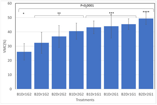 The mean of triple interaction blocks × drainage × geotextile for volumetric moisture content (VMC %) B1: 3 March; B2: 30 March; Dr1: without drainage package, Dr2: with drainage package; G1: without geotextile; G2: with 2 kg/m2 of geotextile. The stars indicate significant statistical differences (*). (Numbers of asteriks *, **, ***, **** indicates p-value).