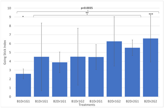 The mean of triple interaction block × drainage × geotextile for Going Stick Index (GSI) B1: 3 March; B2: 30 March; Dr1: without drainage package, Dr2: with drainage package; G1: without geotextile; G2: with 2 kg/m2 of geotextile. The stars indicate significant statistical differences (*). (Numbers of asteriks *, **, *** indicates p-value).