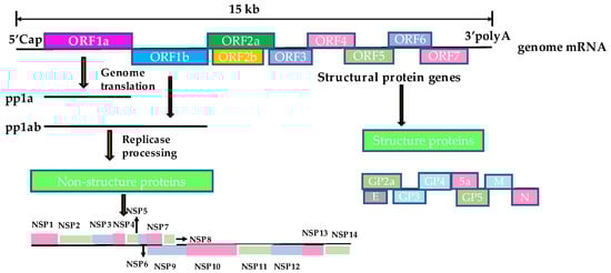 PRRSV is an RNA virus with an envelope and single positive strand [9], belonging to the order Nidovirales and the family Arteriviridae. It also includes lactate dehydrogenase-elevating virus of mice, equine arteritis virus, and simian hemorrhagic fever virus [10]. The total length of the genome is approximately 15 kb, which forms a cap structure at the 5′ end during mRNA processing, and has a poly-A tail structure at the 3′ end [11]. The PRRSV genome contains 12 open reading frames (ORFs): ORF1a, ORF1a’, TF, ORF1b, ORF2a, ORF2b, ORF3, ORF4, ORF5a, and ORF5–ORF7 [12]. Among them, ORF1a and ORF1b encode polyproteins pp1a and pp1b, which can be processed into 17 nonstructural proteins (NSPs) (NSP1α, NSP1β, NSP2, NSP2N, NSP2TF, NSP3-14) that play a major role in virus replication [13,14]. ORF5 and ORF6 encode the major GP5 and M envelope proteins, respectively, which interact with each other to form heterodimers on the surface of virus particles. GP5 is one of the most variable regions of structural proteins in the PRRSV genome and is, therefore, often used for phylogenetic analyses. ORF2, ORF3, and ORF4 encode the minor GP2a, GP3, and GP4 proteins that form noncovalent heterodimers. Two small non-glycosylated proteins E and GP5a are encoded by ORF2b and ORF5a, respectively. ORF7 encodes the highly conserved nucleocapsid protein (N protein) (Figure 1) [15,16,17,18].