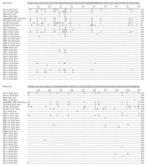 PRRSV GP5 protein has high genetic variation in the PRRSV genome [29]. GP5 protein of the European strain is composed of 201 amino acids, while that of the American strain is composed of 200 amino acids [30]. The amino acid homology deduced from the PRRSV isotype strain of GP5 is between 88% and 99%, while that deduced from GP5 between the European and American strains is between 52% and 55%. The substitution of deduced amino acids of GP5 among strains of the same type mainly occurs in the hypervariable region (26 aa–39 aa) near the outer region of the signal peptide sequence [31,32], whereas, the amino acid variation of GP5 protein of different strains is mainly concentrated in the signal peptide region, neutralizing epitope region, and non-neutralizing epitope region [33].