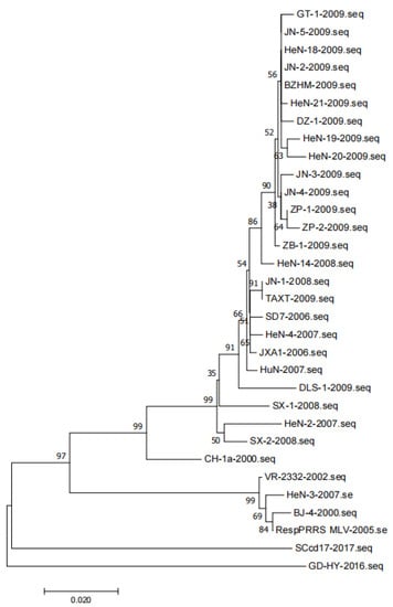- Zhao, X.Y.; Zhang, G.; Wang, Y.; Liu, H.Y.; Chen, Y.; Zhao, J.; Wang, C.Q.; Chen, L.; Li, Y.T. Molecular epidemiological investigation of porcine reproductive and respiratory syndrome virus in Henan province from 2018 to 2019. Chin. J. Vet. Sci. 2020, 40, 2286–2292. [Google Scholar] [CrossRef]