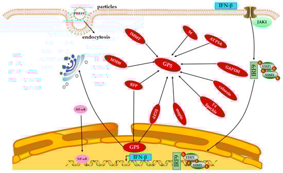 Interactions between PRRSV GP5 protein and host proteins. Abbreviations: GP5, glycoprotein 5; IFN-β, interferon β; PRRSV, porcine reproductive and respiratory syndrome virus; EGFP, enhanced green fluorescent protein; RFP, red fluorescent protein; MYH9, myosin heavy chain 9; GAPDH, glyceraldehyde 3-phosphate dehydrogenase; ATP5A, ATP synthase subunit alpha; IRF9, interferon regulatory factor 9; NF-κB, nuclear factor κB.