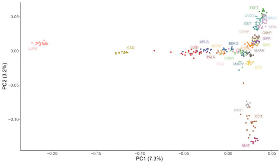 Multidimensional scaling analysis plot showing the first two principal components (PC). Each point represents a subject and each colour a breed: Fonni’s dog (FONN), Pastore Apuano (APUA), Bergamasco Shepherd (BERG), Bracco Italiano (BRAC), Cane Corso Italiano (CCIT), Cirneco dell’Etna (CIRN), Pastore D’Oropa (DORO), English Setter (ESET), German Shepherd dog (GSD), German Shorthaired Pointer (GSHP), German Wirehaired Pointer (GWHP), Italian Greyhound (IGIT), Irish Setter (ISET), Lagotto Romagnolo (LAGO), Lupino del Gigante (LUGI), Lupo Italiano (LUPO), Mannara dog (MANN), Maremma and the Abruzzi Sheepdog (MARM), Mastiffs (MAST), Neapolitan Mastiff (NMIT), Pastore della Lessinia e del Lagorai (PALA), Pastore della Sila (SILA), Segugio Italiano a Pelo Forte (SIPF), Segugio Italiano a Pelo Raso (SIPR), and Spinone Italiano (SPIN).